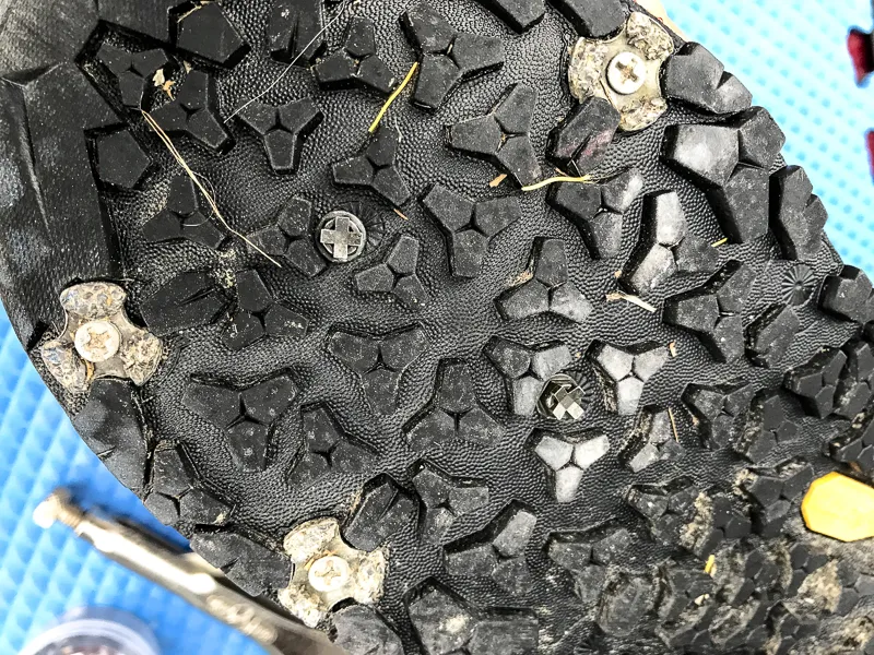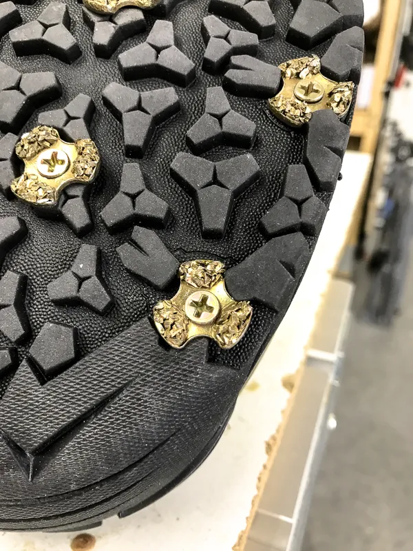 The other issue is that there are only a few of the 'pre-defined locations' on the Vibram soles where the cleats will actually fit in properly. Looking at the image above, you will see that the middle and right cleats fit correctly. The one on the left does not even come close to fitting as the other two do. Simms makes another style of cleat that could fit into these 'pre-defined locations'.