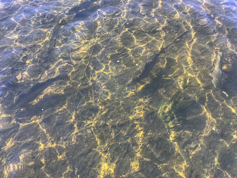 When a fisherman shuffles about in the water, he stirs up the river bed and releases nymphs, larva and other fish food. In no time, large trout will congregate downstream from you and munch on the fish food you stirred up for them. This happened to me a long time ago on this river, but I had forgotten about it. I have read of fishermen bumping into trout as they walked. I never had that experience, but having them gather downstream from me did happen before. To me, this is a bit unsettling to see large trout at your feet. The thought did occur to me that it was pointless casting for trout in front or the the sides of you because all the fish were behind you. Crazy.